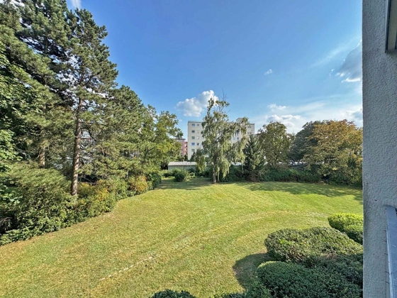 Über die Diele gelangen Sie in das helle Wohn- und Schlafzimmer, das dank einer großzügigen Fensterfront – 2017 erneuert und mit moderner Isolierverglasung versehen – lichtdurchflutet ist und direkten Zugang zur großen, überdachten Loggia bietet. Von hier aus genießt man einen herrlichen Blick in die sehr gepflegte Grünanlage – ein echtes Highlight, das den Wohnkomfort zusätzlich unterstreicht.